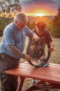 Mike and Larry are brothers, and it’s always special seeing families take on this adventure together. Larry came into the race unsure of how far he could go, but he impressed everyone. On the second day, his frame cracked, thankfully, it happened near the end of the ride so he finished that day. We were stopped at Westside Twins, a motorcycle shop, and they called in a welder with all the right tools. After hours of work, the bike was ready for the next day!