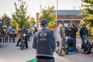 Connor is usually helping wherever and whoever needs it, also blasting music from his Indian Motorcycle. I (Kelsey) am walking around doing a Facebook Live and chatting with anyone willing to talk that early in the morning. Sean is in contact with Kevin while also helping with any last minute repairs. Tom is getting his green flag ready for the day.